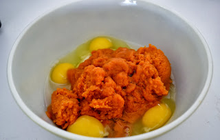 2. In a separate bowl mix pumpkin, eggs, banana and coconut oil into a mixture.